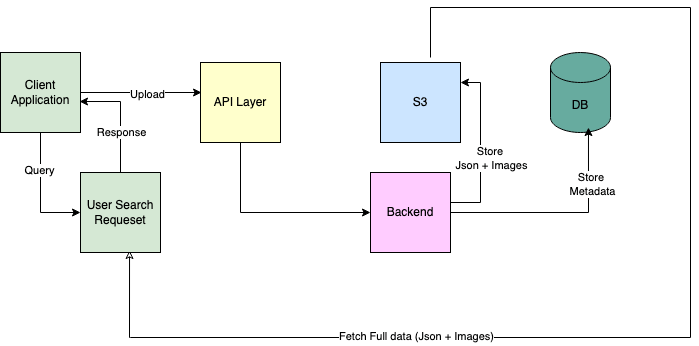 Both paths can fetch the complete data from S3 when needed where the complete json and images will be stored.