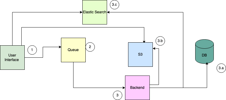 When users search for something, their request hits the API layer, which then queries the database using its indexes for quick searches. If the search needs the complete information, the API fetches the full data from S3.